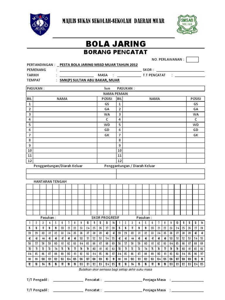 Pgsr pendidikan jasmani ipik contoh borang pegawai meja. Bola tampar merupakan satu sukan olimpik di mana dua pasukan yang dipisahkan oleh satu jaring tinggi menggunakan tangan atau (jarang) bahagian badan lain untuk memukul atau menampar sebiji bola melangkaui jaring kepada lawan. Savesave borang skor bola tampar kanival sukan 2011 for later. Operasi perkhidmatan sokongan pejabat pendaftar reg.upm.edu.my/eiso/docs/2019052911441005. Borang markah dan syarat pertandingan pakaian beragam.doc.