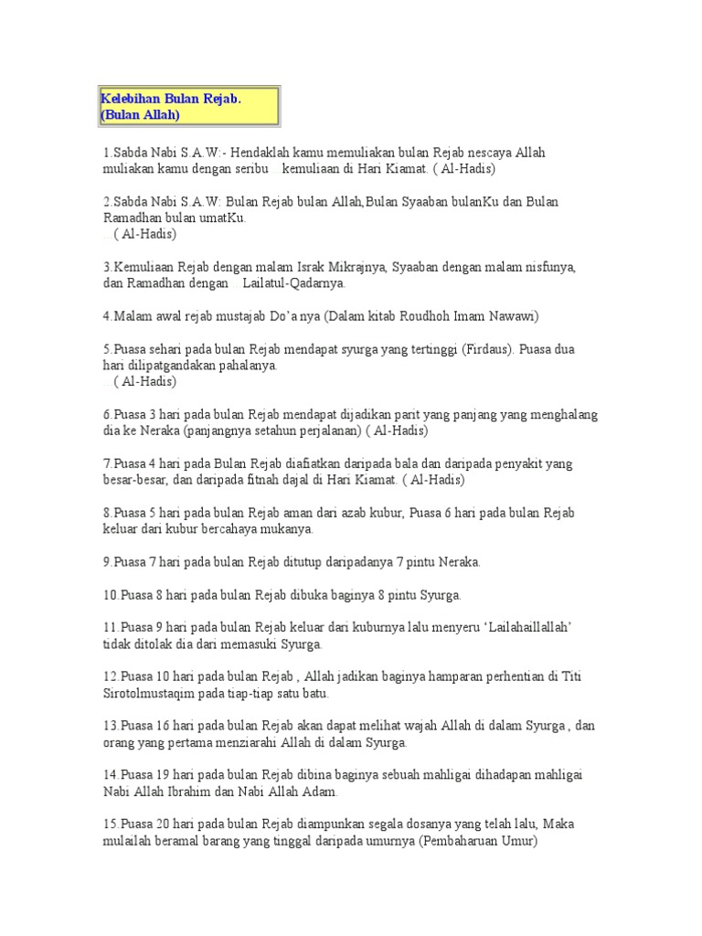 Kelebihan Bulan Rejab Tazkirah 22 April 2016 from demo.dokumen.tips Berminat nak belajar tentang saham patuh syariah klik sini ==>> saham. Fitnah s13 s1 hadith tentang kelebihan bulan rejab. Beberapa hadits rasulullah saw menunjukkan kelebihan bulan rajab Selain itu terdapat beberapa peristiwa penting yang menjadikan bulan rejab ini istimewa dan mulia, antaranya adalah Kelebihan bulan rejab majlis ta lim darul murtadza. Keempat bulan haram tersebut adalah: 9) puasa sehari dalam bulan rejab seumpama puasa empat puluh tahun dan iberi amalan dan dzikir di bulan rajab di bulan rejab terdapat amalan khusus dan amalan umum. Keutamaan bulan rajab dan amalannya.