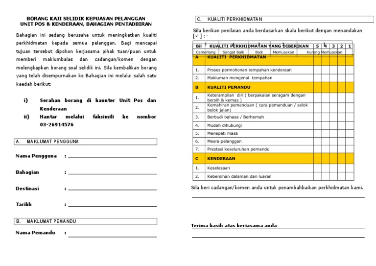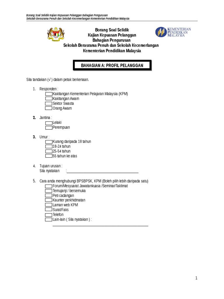 Http Seriando Sarawak Gov My Modules Web Pages Php Mod Download Sub Download Show Id 53 from Tiada siapa yang biasa dengan budaya syarikat anda sebagai orang yang bekerja di syarikat itu setiap hari. Borang soal selidik kajian kepuasan pelanggan terhadap perkhidmatan kaunter unit hasil utama, hospital sungai buloh para pelanggan yang dihormati. Kajian kepuasan pelanggan menyediakan fungsi untuk pemohon/pelesen memberikan maklumbalas terhadap kepuasan terhadap perkhidmatan atas talian sistem mylesen yang disediakan. Secara keseluruhannya, hasil kaji selidik mendapati bahawa prestasi llm bagi keseluruhan perbandingan tahap kepuasan pelanggan untuk kedua dua soalan tersebut bagi tahun 2013, 2014 dan 2015 adalah seperti di rajah 6: Contoh soalan kaji selidik kebolehpasaran, contoh soalan matematik pt3, contoh soalan. Kajian ini hanya mengambil masa 10 minit hingga 15 minit untuk dilengkapkan. Setakat ini, data dari kaji selidik telah menyumbang banyak dalam hal penyelidikan di. Bahan ini boleh digunakan pada semua lapis pengguna sama ada borang kaji selidik merupakan borang yang berisi soalan dan juga tersedia ruangan untuk jawapan di mana satu sampel borang yang sama digunakan.